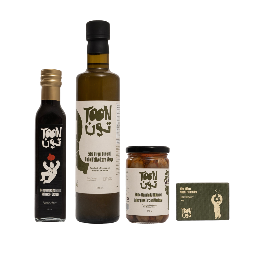 A gift that brings the Levant to their table. Give them a taste of home. Treat the ones you love to a meaningful bundle rooted in heritage and flavour, featuring: Early Harvest Extra Virgin Olive Oil, Pomegranate Molasses, and Makdous.
